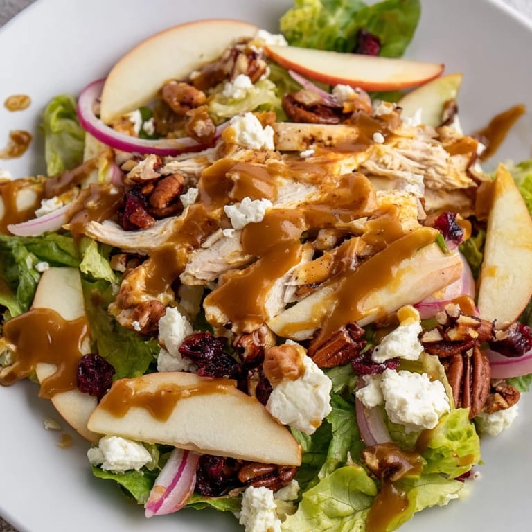 Save The smell of butter and brown sugar bubbling in a tiny saucepan reminded me instantly of county fairs and caramel apples on sticks. I had leftover roast chicken one chilly October afternoon and a bag of apples that needed using, and suddenly I thought, why not pour that warm, nutty sweetness over greens? It felt a little reckless at first, mixing caramel into a salad, but the moment I tasted that first forkful of crisp apple, tender chicken, and sticky-sweet dressing, I knew I'd stumbled onto something special.