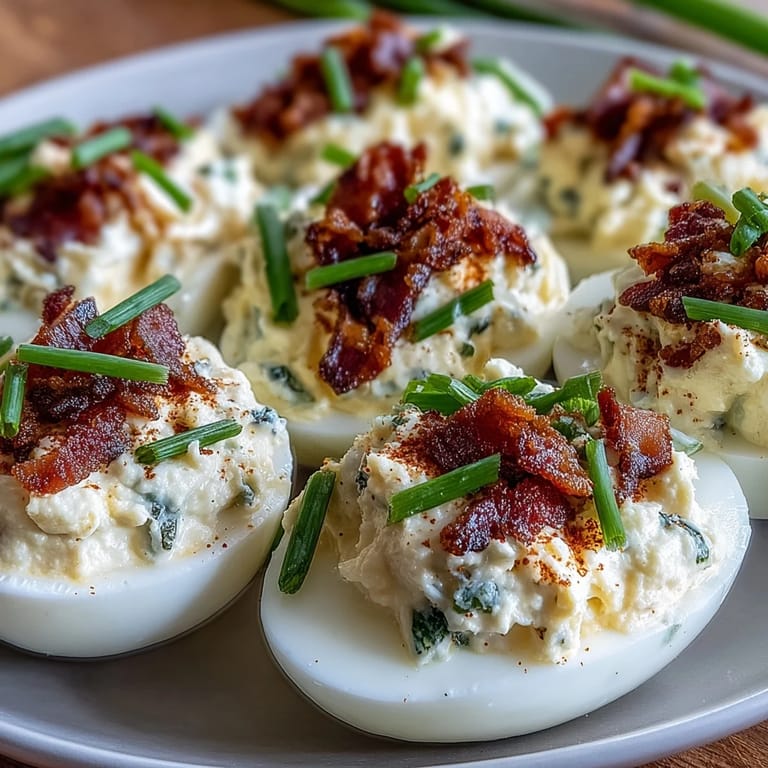 Save The sound of bacon sizzling on the stove always signals something exciting in the kitchen, and the aroma clings to my sleeves long after the cooking's done. Last week, while prepping for friends coming over unexpectedly, I eyed a basket of eggs and remembered how cream cheese adds silkiness to everything—so why not to deviled eggs? Merging jalapeño poppers with this classic appetizer wasn't planned, but it turned out to be exactly what we needed. It's amazing how a humble idea born in a rush can transform into a party staple. The anticipation I felt as I spooned the spicy, creamy filling into each egg white was matched only by the eagerness of my guests to dig in.