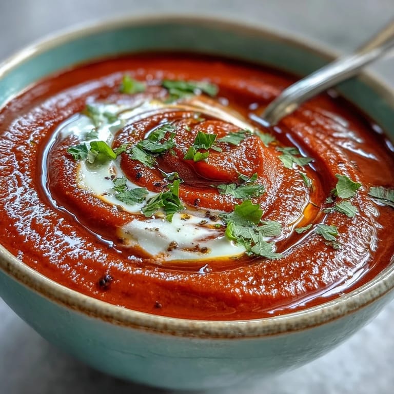 Save There's something almost magical about the moment you pull roasted red peppers from the oven—the kitchen fills with this sweet, smoky perfume that makes you stand still for a second. I discovered this soup by accident when I had too many peppers at the farmers market and a half-empty pot of harissa staring me down. What started as an attempt to use up vegetables turned into something I now make whenever I need to feel like I'm doing something special in the kitchen, even on a Tuesday.